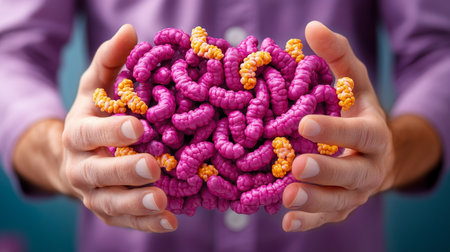A hand holding a model or representation of the gut, symbolizing the act of studying digestive health, probiotics, and the complex microbiome.