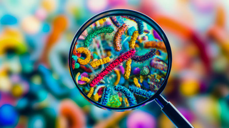 Detailed illustration of bacteria viewed through a magnifying glass, showing colorful microscopic organisms with various shapes and textures.