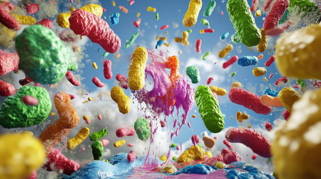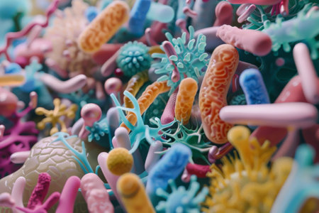 This image showcases a vivid and colorful illustration of microorganisms, highlighting their intricate shapes and structures. Perfect for science and health themes.