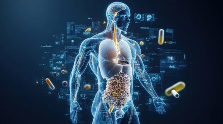 transparent human figure blue neon of a human internal organs with the intestine Showing body testine highlighted in yellow ,mri ,transparent of Nutrients, various vitamins, around the body , --ar 16:9 --personalize jaydbm9 --v 6.1 Job ID: 4c32e3e8-c6dd-4d02-84e3-25c445fadfa7