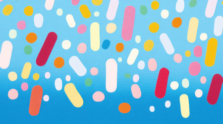 Bright abstract background featuring colorful shapes and dots on a blue canvas, perfect for creative projects and contemporary art themes.