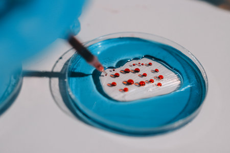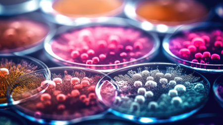 Gloved hands of a scientist examining vibrant microbial colonies in petri dishes, conducting research on infectious diseases and developing new treatments
