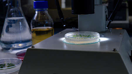 Culture in a petri dish under a light stereomicroscope is examined for pharmaceutical bioscience research. Concept of science, laboratory and study of diseases.