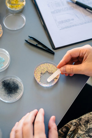 Unrecognizable female scientist hands taking sample of small plastic particles from golden glitter on petri dish in environment research laboratory. Concept of analysis in microplastics composition.
