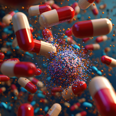 Colored capsules surround bacteria, representing medical progress in combating infections and improving human health outcomes.