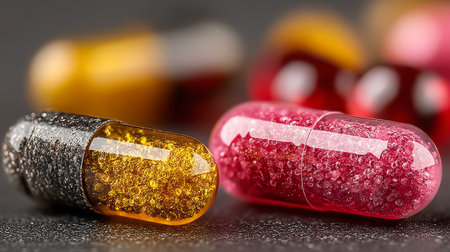 Close-up of vibrant red and yellow capsules on a textured dark surface