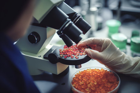 Hands in purple gloves carefully hold a collection of yellow and orange balls, symbolizing safety and precision in scientific experimentation within a laboratory setting.