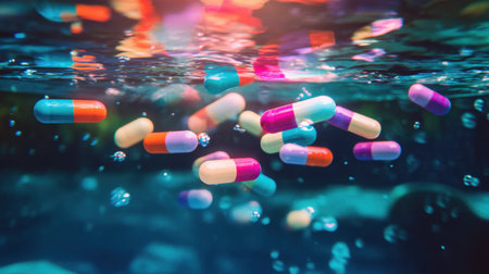 A vibrant composition of a pill bottle and colorful tablets, glowing underwater with refracted light.
