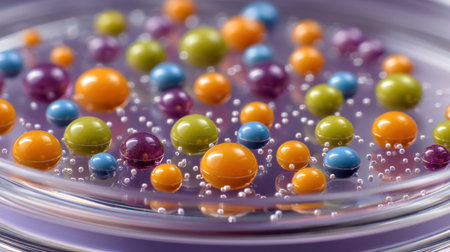 Close-up view of colorful liquid droplets resting on a purple background in a petri dish, surrounded by tiny air bubbles, representing creativity and scientific exploration.