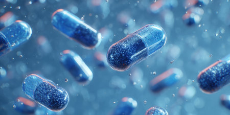 floating blue capsules, medicines, vitamins