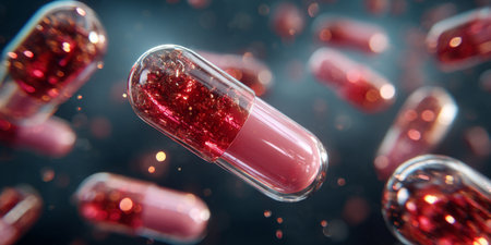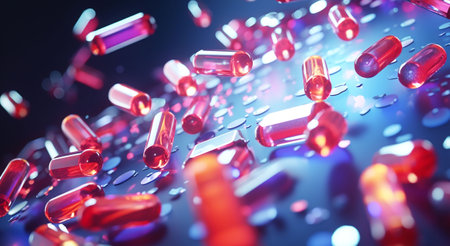 Red and orange glittering pharmaceutical drug capsules falling on a dark background