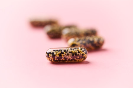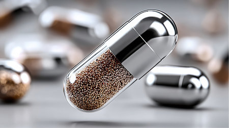 A clear capsule filled with small brown pellets is showcased in sharp focus, while other capsules, metallic and blurred, are on the background. The capsules sit on a gray surface.
