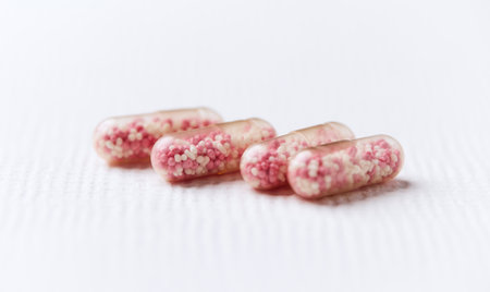 Close up of a group of pink pills on a white background.