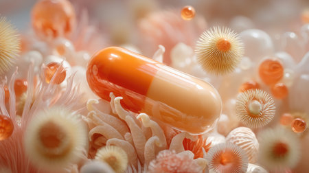 A bright orange medicine capsule rests among an array of soft organic shapes and textures, creating a visually striking composition. Ideal for health-related themes.