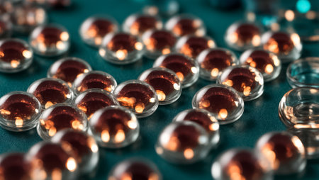 Close-up shot of shiny glass spheres with a golden dust texture, reflecting light and creating an abstract background.