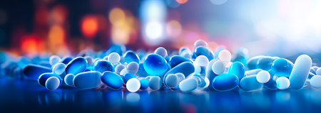 Blue and purple shiny capsules close up as a background. Antibiotic drug resistance concept.