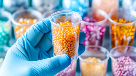 A gloved hand reaches for a glass container filled with vibrant beads among several others, showcasing a variety of colors and liquid samples in a lab.
