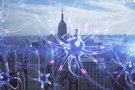 Double exposure of neuron drawing icon and cityscape background. Concept of education.