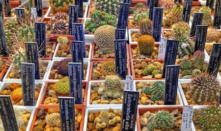 Beautiful view with variety of cactus plants in pots and labels with their names