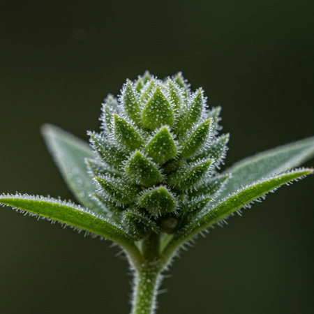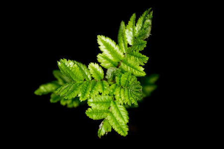 A detailed macro shot of a vibrant green plant with sharp, radiating leaves, set against a deep black backdrop.