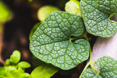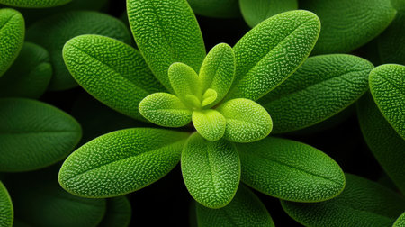 This stunning close-up captures lush green leaves featuring unique textures and patterns, ideal for nature-themed projects and designs emphasizing tranquility and freshness.