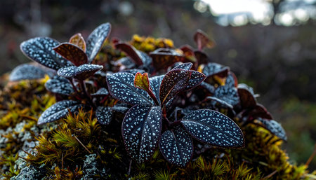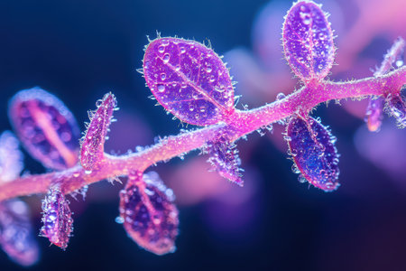Vibrant purple leaves covered in tiny water droplets shimmer under soft light creating a refreshing and captivating natural detail.