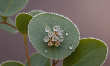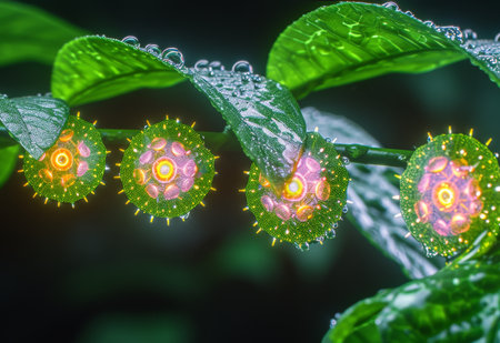 A captivating close-up of vibrant green flora adorned with glistening water droplets, showcasing the delicate beauty of nature in a tranquil environment.