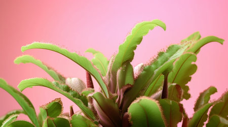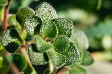 Macro photograph showcasing fuzzy green leaves on a vibrant green background, emphasizing texture and natural details with a focus on organic beauty. Aichryson laxum.