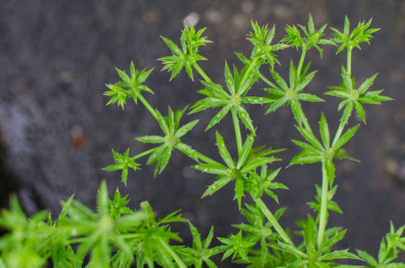 Galium aparine cleavers, catchweed, stickyweed, robin-run-the-hedge, sticky willy, sticky willow, stickeljack, and grip grass use in traditional medicine for treatment. Soft focus. Film grain.