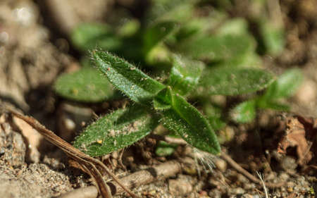 Close-up of hairy rosette with dew drops and fallen leaves of Verbascum thapsus large or common mullein in its first year of growth.