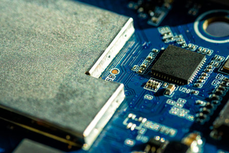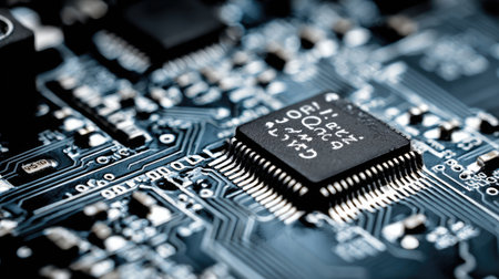 Detailed macro shot of electronic circuit board with microchips and technology components