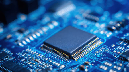 A detailed view of a computer circuit board featuring a central microprocessor surrounded by various electronic parts. The bright blue background highlights the intricate design.