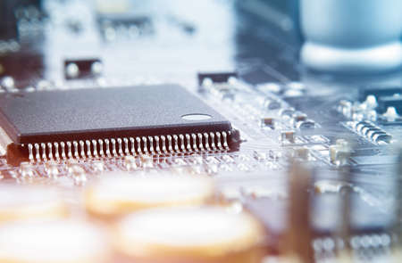 Circuit board close-up. Technology background. Motherboard digital chip.