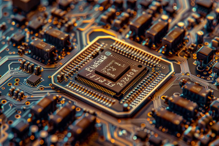 This close-up image showcases a central processing unit mounted on a circuit board, featuring a gold heat sink and various electronic components. It highlights intricate details and technological precision.