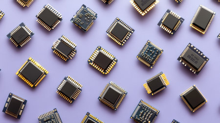 A diverse collection of microchips and integrated circuits displayed on a smooth purple surface, highlighting technological advancement in electronics and design.