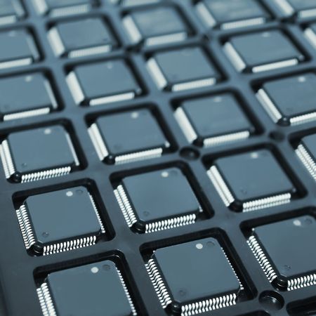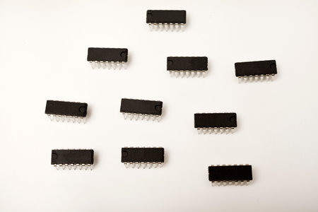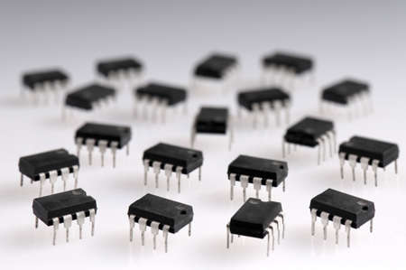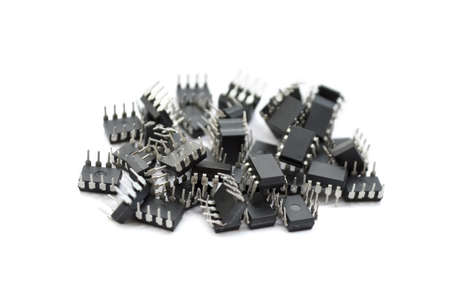 Microchips in a DIP case on a white background. A microelectronic element. Black microchips.