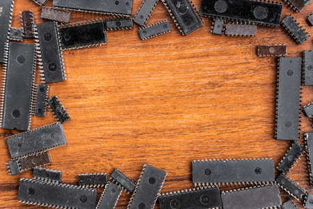 Old microchips on a wooden table lie in the form of a frame with free space for text in the center. Moke up. Close up.
