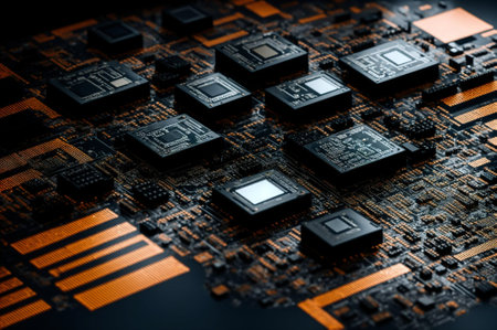 Vibrant close-up of a circuit board featuring various microchips and transistors, showcasing the intricate design and technology in modern electronics. Ideal for tech-related projects.