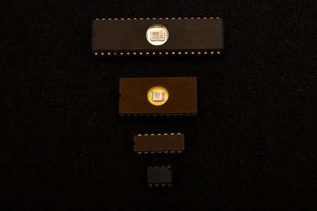 Several microchips on black foam. Old integrated circuits for radio electronics.
