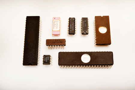 Group of electronic microchip isolated on a white background. Electronic components close-up, selective focus