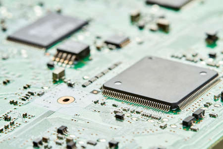 Computer Microchips and Processors on Electronic circuit board. computer hardware technology. Abstract technology microelectronics concept background. Macro shot, shallow focus.
