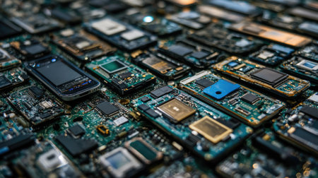 A vibrant composition of circuit boards and electronic components showcases intricate details and textures, highlighting modern technology and innovation.