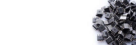 Panoramic banner Pile of Integrated circuit chip on white background with copyspace. Microchip type soic8. Minimal electronic concept