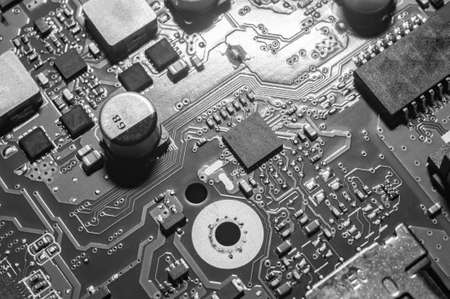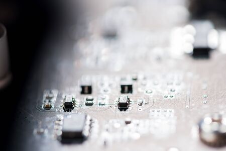 Macro shot of Circuit board with resistors microchips and electronic components. Computer hardware technology. Integrated communication processor. Information engineering. Semiconductor. PCB. Closeup