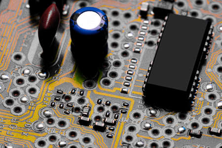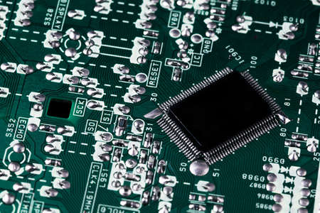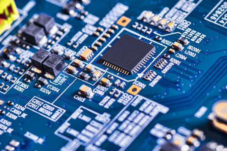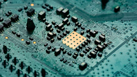 Computer Microchips and Processors on Electronic circuit board. computer hardware technology. Abstract technology microelectronics concept background. Macro shot, shallow focus.