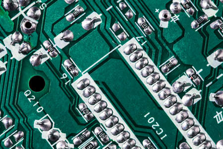Macro close-up shot of green circuit board, computer motherboard Components: microcircuits, processor, transistors, semiconductors. Inside an electronic device, parts of a supercomputer.