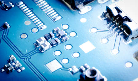 Electronic components, chips and capacitors on the blue pcb, close up view. Technology concept