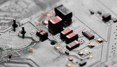Computer electronics manufacturing industry, motherboard complex circuitry, generic circuit board electrical parts components macro, object detail, extreme closeup, shallow dof, nobody, technology
