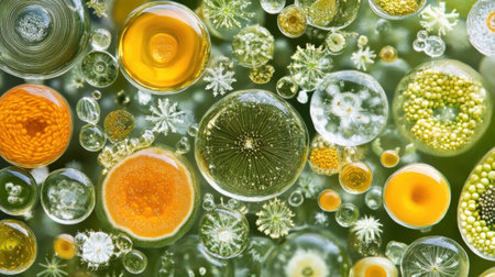 Algae, microalgae in petri dishes research in laboratories. biotechnology, science. Flat lay, top view. Macro. Technologies for the production of artificial plant-based food. Generative AI