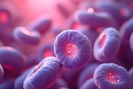 This macro image showcases red and blue spherical cells suspended in an abstract scientific background, ideal for themes of biology, health, and microscopic research.